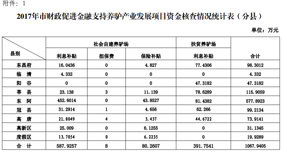 据了解,根据日前下发的《关于组织开展 2017 年市财政促进金融支持养驴产业 发展工作的通知》(聊牧字[2017]230 号)要求,各县(市区)申报了 2017 年养驴产业贷款贴息、保险费及担保 费等材料。截至 2017 年 11 月 21 日,共有东昌府区、东阿县等 9 个县(市区)上报了申报材料。